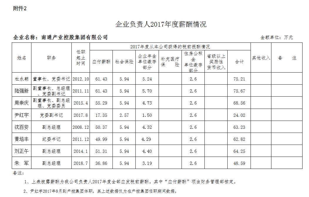 南通產(chǎn)業(yè)控股集團有限公司2017年度薪酬信息披露公告