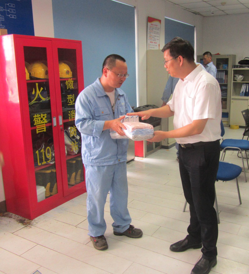 近日持續(xù)高溫, 8月18日下午,產(chǎn)控集團(tuán)董事長張劍橋前往江山農(nóng)化、江天化學(xué)、醋酸化工等企業(yè)慰問堅守生產(chǎn)崗位的一線職工,送去毛巾、藿香正氣液、仁丹、風(fēng)油精等防暑降溫物資。